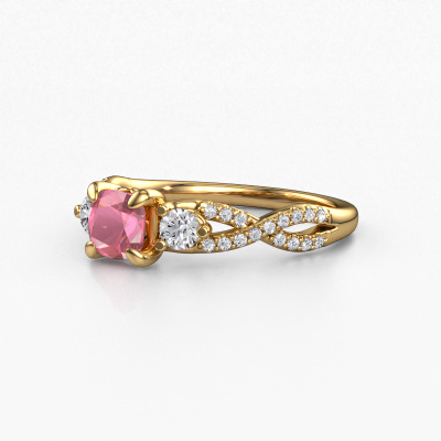 The ring shown above is called the Marilou CUS. We call this type of ring a 3-stone ring because it has one centre gemstone and a band that is also pave set with gemstones. The 14 Carat gold engagement ring is set with a cushion 5 mm tourmaline pink centre stone and the band is pave set with diamond gemstones. Each jewel is unique in every way! Simply customize to your liking,This traditional gold 3-stone engagement ring has an exquisite cushion tourmaline pink centre stone. To further accentuate the centre stone, the band is fully set with more diamonds. Its open prong setting allows light to strike the tourmaline pink from various angles and this adds sparkle to your tourmaline pink ring. The photo shown above depicts the goldsmith's carefully handcrafted details of the ring. The high positioning of the centre stone is truly eye-catching. The perfect engagement ring for the crown jewel of your life! By using a combination of the latest modern techniques, combined with ancient crafting, we can make all our engagement rings in our own studio. Each jewel is made to order. This is advantageous because we can offer you a price you won't find anywhere else.Our team adds new designs to our online collection daily. Our designers and goldsmiths work together in creating the best design. We strive to offer a diverse collection of jewels. Perhaps you have a specific jewel design in mind. One you came across somewhere. Please contact us for a free consultation. We will make you an offer, based on a fair price/ quality ratio, that will baffle you.To make it easier for you, we offer a 30 day return policy. Check our terms and conditions.