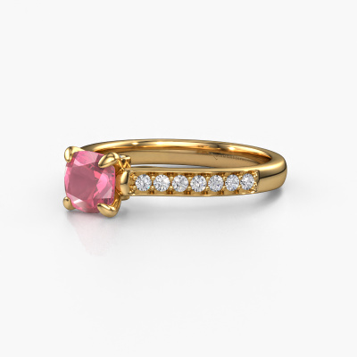 The ring shown above is called the Valorie cus 2. We call this type of ring a pavé solitaire ring because it has one centre gemstone and a band that is also pave set with gemstones. The 14 Carat gold engagement ring is set with a cushion 5.5 mm tourmaline pink centre stone and the band is pave set with diamond gemstones. Each jewel is made just for you by our master goldsmiths in our own studio.This traditional gold pavé solitaire engagement ring has an exquisite cushion tourmaline pink centre stone. To further accentuate the centre stone, the band is fully set with more diamonds. Its open prong setting allows light to strike the tourmaline pink from various angles and this adds sparkle to your tourmaline pink ring. The photo shown above depicts the goldsmith's carefully handcrafted details of the ring. The high positioning of the centre stone is truly eye-catching. The perfect engagement ring for the crown jewel of your life! By using a combination of the latest modern techniques, combined with ancient crafting, we can make all our engagement rings in our own studio. Each jewel is made to order. This is advantageous because we can offer you a price you won't find anywhere else.Our designers and goldsmiths work together each day, creating new jewels. Perhaps you have found a nice traditional engagement ring somewhere, which can be used to customize your unique ring. Please feel free to contact us. We will make you an offer, based on a fair price/ quality ratio, which will amaze you.To make it easier for you, we offer a 30 day return policy. Check our terms and conditions.