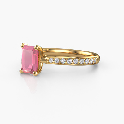 The ring shown above is called the Mignon eme 2. We call this type of ring a pavé solitaire ring because it has one centre gemstone and a band that is also pave set with gemstones. The 14 Carat gold engagement ring is set with a emerald cut 7x5 mm tourmaline pink centre stone and the band is pave set with lab grown diamond gemstones. Each jewel is made just for you, with attention to detail and design.This exclusive gold pavé solitaire engagement ring has an exquisite emerald cut tourmaline pink centre stone. To further accentuate the centre stone, the band is fully set with more lab-grown diamonds. Its open prong setting allows light to strike the tourmaline pink from various angles and this adds sparkle to your tourmaline pink ring. The photo shown above depicts the goldsmith's carefully handcrafted details of the ring. The high positioning of the centre stone is truly eye-catching. The perfect engagement ring for the crown jewel of your life! Are you on a budget? Please feel free to contact us, so we can go discuss your options. We offer our engagement rings at guaranteed best price, because we make them to order. You won't find such a price anywhere else!Do you have a specific ring in mind? One you came across somewhere. Please feel free to tell us your wishes and we will turn your design into a unique engagement ring. You can follow the development of your ring design because we use 3D drawings. This gives you a realistic preview of your design. We will gladly send you a non-binding offer, based on a fair price/ quality ratio. It will amaze you.To make it easier for you, we offer a 30 day return policy. Check our terms and conditions.