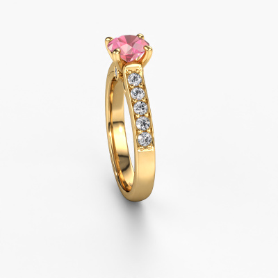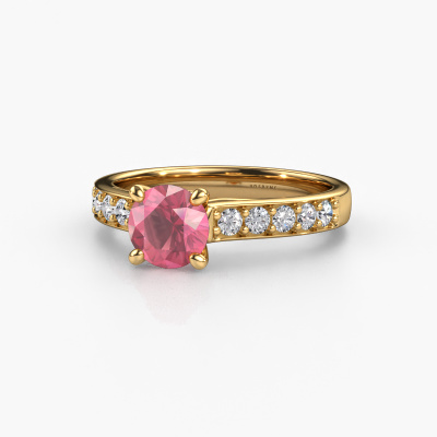 The ring shown above is called the Valorie RND 2. We call this type of ring a pavé solitaire ring because it has one centre gemstone and a band that is also pave set with gemstones. The 14 Carat gold engagement ring is set with a round 6.5 mm tourmaline pink centre stone and the band is pave set with lab grown diamond gemstones. Each jewel is made just for you, with attention to detail and design.This modern gold pavé solitaire engagement ring has an exquisite round tourmaline pink centre stone. To further accentuate the centre stone, the band is fully set with more lab-grown diamonds. Its open prong setting allows light to strike the tourmaline pink from various angles and this adds sparkle to your tourmaline pink ring. The photo shown above depicts the goldsmith's carefully handcrafted details of the ring. The high positioning of the centre stone is truly eye-catching. The perfect engagement ring for the crown jewel of your life! By using our modern techniques, we can design and customize the finest quality jewels with the utmost care for you. Our engagement rings are always priced 30 percent lower than other jewellers. We make engagement rings to order so we don't have to maintain a large stock. If you have a certain budget, we are more than happy to advice you accordingly.Our designers and goldsmiths work together each day, creating new jewels. Perhaps you have found a nice modern engagement ring somewhere, which can be used to customize your unique ring. Please feel free to contact us. We will make you an offer, based on a fair price/ quality ratio, which will amaze you.To make it easier for you, we offer a 30 day return policy. Check our terms and conditions.