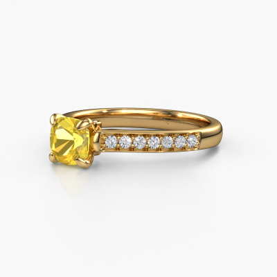 The ring shown above is called the Valorie cus 2. We call this type of ring a pavé solitaire ring because it has one centre gemstone and a band that is also pave set with gemstones. The 14 Carat gold engagement ring is set with a cushion 5.5 mm yellow sapphire centre stone and the band is pave set with diamond gemstones. Each jewel is made just for you by our master goldsmiths in our own studio.This traditional gold pavé solitaire engagement ring has an exquisite cushion yellow sapphire centre stone. To further accentuate the centre stone, the band is fully set with more diamonds. Its open prong setting allows light to strike the yellow sapphire from various angles and this adds sparkle to your yellow sapphire ring. The photo shown above depicts the goldsmith's carefully handcrafted details of the ring. The high positioning of the centre stone is truly eye-catching. The perfect engagement ring for the crown jewel of your life! By using a combination of the latest modern techniques, combined with ancient crafting, we can make all our engagement rings in our own studio. Each jewel is made to order. This is advantageous because we can offer you a price you won't find anywhere else.Our designers and goldsmiths work together each day, creating new jewels. Perhaps you have found a nice traditional engagement ring somewhere, which can be used to customize your unique ring. Please feel free to contact us. We will make you an offer, based on a fair price/ quality ratio, which will amaze you.To make it easier for you, we offer a 30 day return policy. Check our terms and conditions.