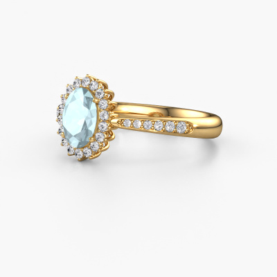 The ring shown above is called the Tilly ovl 2. We call this type of ring a cluster ring, the centre gemstone is surrounded by smaller sized stones. This 14 Carat gold version is set with a 7x5 mm oval aquamarine centre stone, embraced by smaller lab-grown diamonds. If you look at this gold cluster engagement ring, you might get the impression that its smaller sized stones collide with the bigger aquamarine, so it is shaped like a flower. Therefore this engagement ring is also known as the flower ring. Our artisan goldsmiths get the job done. Each individual stone is carefully set by hand. During manufacturing, light fall is constantly monitored to make sure the special cluster effect is still visible. In the end you get the perfect engagement ring with a radiant aquamarine gemstone centrepiece. You can imagine the effect of a ring of such significance when you give tot the love of your life on her special day to shine. By using our modern techniques, we can design and customize the finest quality jewels with the utmost care for you. Our engagement rings are always priced 30 percent lower than other jewellers. We make engagement rings to order so we don't have to maintain a large stock. If you have a certain budget, we are more than happy to advice you accordingly.Different styles of new rings are made daily by our team. Perhaps you have found a cluster engagement ring somewhere. One you would like to give to your loved one. Please feel free to share your thoughts and design with our jewel designers. We would love to turn your design into a classic engagement ring. You can follow the development of your ring design because we use very detailed 3D drawings. On top of that, you can order a dummy of the design. A dummy is a plastic ring, which can be shaped according your ring design. You can try it on and check if the engagement ring is up to standard. We will gladly send you a non-binding offer, based on a fair price/ quality ratio. The offer will baffle you, considering the quality of the ring and gemstones.To make it easier for you, we offer a 30 day return policy. Check our terms and conditions.
