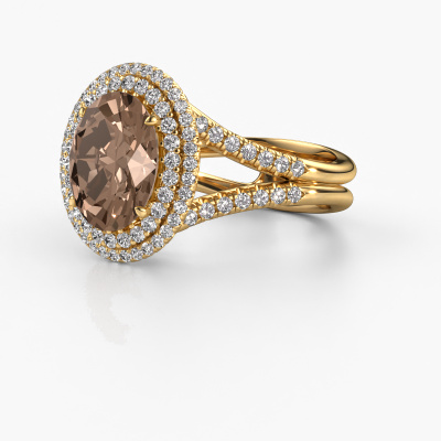 The ring shown above is called the Elvie. We call this type of ring a halo ring because it has one centre gemstone and a band that is also pave set with gemstones. The 14 Carat gold engagement ring is set with a oval 2.70 crt brown diamond centre stone and the band is pave set with lab-grown diamonds. What makes this vintage gold pavé solitaire ring special are the smaller sized stones embracing the centre stone. This gorgeous engagement ring is called a pavé solitaire ring because the smaller gemstones give the centre stone a pavé solitaire of surrounding light. In order for the smaller stones to enhance the centre stone, they have to be placed so there is no interference of light. And that's when our expert goldsmiths come in. Each individual stone is carefully set in the ring by hand. During manufacturing, light fall is constantly monitored to make sure the special pavé solitaire is still visible. In the end you get a unique engagement ring, with a brown diamond of your choosing at its centre. You can imagine the effect of a ring of such significance when you give it to her on her special day to shine. By using our modern techniques, we can design and customize the finest quality jewels with the utmost care for you. Our engagement rings are always priced 30 percent lower than other jewellers. We make engagement rings to order so we don't have to maintain a large stock. If you have a certain budget, we are more than happy to advice you accordingly.Do you have a specific ring in mind? One you came across somewhere. Please feel free to tell us your wishes and we will turn your design into a unique engagement ring. You can follow the development of your ring design because we use 3D drawings. This gives you a realistic preview of your design. We will gladly send you a non-binding offer, based on a fair price/ quality ratio. It will amaze you.To make it easier for you, we offer a 30 day return policy. Check our terms and conditions.