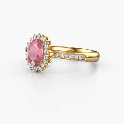 The ring shown above is called the Tilly ovl 2. We call this type of ring a cluster ring, the centre gemstone is surrounded by smaller sized stones. This 14 Carat gold version is set with a 7x5 mm oval tourmaline pink centre stone, embraced by smaller lab-grown diamonds. If you look at this gold cluster engagement ring, you might get the impression that its smaller sized stones collide with the bigger tourmaline pink, so it is shaped like a flower. Therefore this engagement ring is also known as the flower ring. Our artisan goldsmiths get the job done. Each individual stone is carefully set by hand. During manufacturing, light fall is constantly monitored to make sure the special cluster effect is still visible. In the end you get the perfect engagement ring with a radiant tourmaline pink gemstone centrepiece. You can imagine the effect of a ring of such significance when you give tot the love of your life on her special day to shine. By using our modern techniques, we can design and customize the finest quality jewels with the utmost care for you. Our engagement rings are always priced 30 percent lower than other jewellers. We make engagement rings to order so we don't have to maintain a large stock. If you have a certain budget, we are more than happy to advice you accordingly.Different styles of new rings are made daily by our team. Perhaps you have found a cluster engagement ring somewhere. One you would like to give to your loved one. Please feel free to share your thoughts and design with our jewel designers. We would love to turn your design into a classic engagement ring. You can follow the development of your ring design because we use very detailed 3D drawings. On top of that, you can order a dummy of the design. A dummy is a plastic ring, which can be shaped according your ring design. You can try it on and check if the engagement ring is up to standard. We will gladly send you a non-binding offer, based on a fair price/ quality ratio. The offer will baffle you, considering the quality of the ring and gemstones.To make it easier for you, we offer a 30 day return policy. Check our terms and conditions.