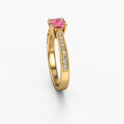 This 14 Carat gold ring is called Shonta CUS and is set with 5.5 mm tourmaline pink. This filigree gold engagement ring is a true work of art! A beautifully adorned design of intricate wires. With dedication, patience and the utmost precision, our expert goldsmith will design a ring just for you. The adornment of small wiring is crafted to perfection by hand. It's a lengthy process which includes welding, crafting and polishing until our Goldsmiths are completely satisfied with the result: a perfect eye-catching ring that makes her shine with delight. Therefore the vintage filigree engagement ring is an extraordinary gift to bestow upon the love of your life. A handmade one-of-a-kind personalized ring, to be given to that special someone on that special moment when you pop the question. Isn't that wonderful? This piece of jewellery is created to add sparkle to your finger, each jewel is lovingly made by hand by our goldsmiths.After receiving your order, our goldsmiths will start the creative process of making your Shonta CUS engagement ring. We don't keep stock. This is advantageous because these costs will not be passed on to you. Therefore, we can offer jewellery at exceptionally low prices.Our designers and goldsmiths work together each day, creating new jewels. Perhaps you have found a nice vintage engagement ring somewhere, which can be used to customize your unique ring. Please feel free to contact us. We will make you an offer, based on a fair price/ quality ratio, which will amaze you.To make it easier for you, we offer a 30 day return policy. Check our terms and conditions.
