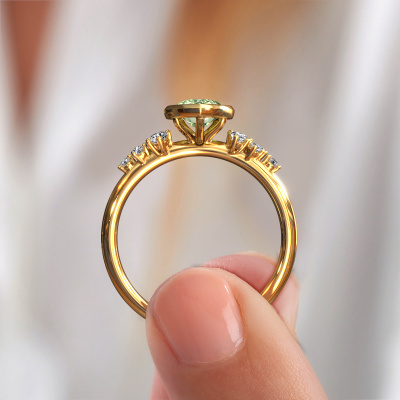 This 14 Carat gold ring is called Aliyah PER and is set with green lab grown diamond. Are you in the market for a unique gold engagement ring with a trendy appearance? Then this ring is perfect for you. Simply customize to your or her liking. This trendy beautiful engagement ring is set with exquisite green lab grown diamond. It has been carefully selected because your engagement ring must be adorned with nothing but the most beautiful gemstone. Our expert goldsmith will create your ring in our own studio where the green lab grown diamond will be set with great care. The ring will then be polished to perfection to give it that extra sparkle. The perfect ring for your significant other! By using our modern techniques, we can design and customize the finest quality jewels with the utmost care for you. Our engagement rings are always priced 30 percent lower than other jewellers. We make engagement rings to order so we don't have to maintain a large stock. If you have a certain budget, we are more than happy to advice you accordingly.Our team adds new designs to our online collection daily. Our designers and goldsmiths work together in creating the best design. We strive to offer a diverse collection of jewels. Perhaps you have a specific jewel design in mind. One you came across somewhere. Please contact us for a free consultation. We will make you an offer, based on a fair price/ quality ratio, that will baffle you.To make it easier for you, we offer a 30 day return policy. Check our terms and conditions.