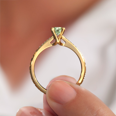 This 14 Carat gold ring is called Mei and is set with green lab grown diamond. An extraordinary gold vintage ring. One that will surely make the love of your life shine like a diamond! That is what we hope to achieve. This Celtic engagement ring is set with exquisite green lab grown diamonds. Whichever gemstone you choose from our selection, is up to you. The gemstone is selected with great care because we believe your engagement ring must be adorned with nothing but the most beautiful gemstone. Wouldn't you agree? Our expert goldsmith will design your ring in our own artisan studio, where the green lab grown diamond will be set with great precision. The ring will then be polished till it is absolutely perfect. Nothing but the best for the love of your life! This jewel is made just for you, with attention to detail and design.Are you on a budget? Please feel free to contact us, so we can go discuss your options. We offer our engagement rings at guaranteed best price, because we make them to order. You won't find such a price anywhere else!Our team adds new designs to our online collection daily. Our designers and goldsmiths work together in creating the best design. We strive to offer a diverse collection of jewels. Perhaps you have a specific jewel design in mind. One you came across somewhere. Please contact us for a free consultation. We will make you an offer, based on a fair price/ quality ratio, that will baffle you.To make it easier for you, we offer a 30 day return policy. Check our terms and conditions.