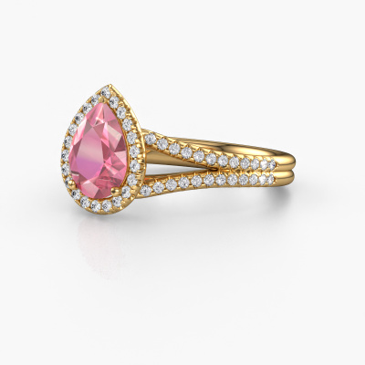 The ring shown above is called the Verla pear 2. We call this type of ring a halo ring because it has one centre gemstone and a band that is also pave set with gemstones. The 14 Carat gold engagement ring is set with a pear 8x6 mm tourmaline pink centre stone and the band is pave set with diamonds. What makes this exclusive gold halo ring special are the smaller sized stones embracing the centre stone. This gorgeous engagement ring is called a halo ring because the smaller gemstones give the centre stone a halo of surrounding light. In order for the smaller stones to enhance the centre stone, they have to be placed so there is no interference of light. And that's when our expert goldsmiths come in. Each individual stone is carefully set in the ring by hand. During manufacturing, light fall is constantly monitored to make sure the special halo is still visible. In the end you get a unique engagement ring, with a tourmaline pink of your choosing at its centre. You can imagine the effect of a ring of such significance when you give it to her on her special day to shine. After receiving your order, our goldsmiths will passionately start the creative process of making your engagement ring in our own studio. Because we don't have a big stockpile, these costs will not be passed on to you. Our pricing is proof of that! We offer top quality jewels at lowest price, guaranteed.Our designers and goldsmiths work together each day, creating new jewels. Perhaps you have found a nice exclusive engagement ring somewhere, which can be used to customize your unique ring. Please feel free to contact us. We will make you an offer, based on a fair price/ quality ratio, which will amaze you.To make it easier for you, we offer a 30 day return policy. Check our terms and conditions.
