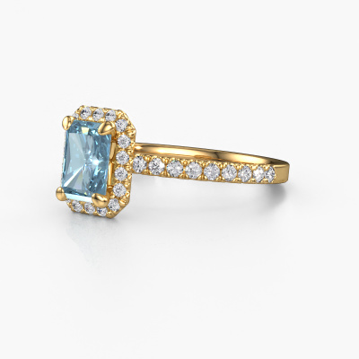 The ring shown above is called the Miranda rad. We call this type of ring a halo ring because it has one centre gemstone and a band that is also pave set with gemstones. The 14 Carat gold engagement ring is set with a radiant 7x5 mm blue lab grown diamond centre stone and the band is pave set with lab-grown diamonds. What makes this exclusive gold halo ring special are the smaller sized stones embracing the centre stone. This gorgeous engagement ring is called a halo ring because the smaller gemstones give the centre stone a halo of surrounding light. In order for the smaller stones to enhance the centre stone, they have to be placed so there is no interference of light. And that's when our expert goldsmiths come in. Each individual stone is carefully set in the ring by hand. During manufacturing, light fall is constantly monitored to make sure the special halo is still visible. In the end you get a unique engagement ring, with a blue lab grown diamond of your choosing at its centre. You can imagine the effect of a ring of such significance when you give it to her on her special day to shine. After receiving your order, our goldsmiths will passionately start the creative process of making your engagement ring in our own studio. Because we don't have a big stockpile, these costs will not be passed on to you. Our pricing is proof of that! We offer top quality jewels at lowest price, guaranteed.Our team adds new designs to our online collection daily. Our designers and goldsmiths work together in creating the best design. We strive to offer a diverse collection of jewels. Perhaps you have a specific jewel design in mind. One you came across somewhere. Please contact us for a free consultation. We will make you an offer, based on a fair price/ quality ratio, that will baffle you.To make it easier for you, we offer a 30 day return policy. Check our terms and conditions.