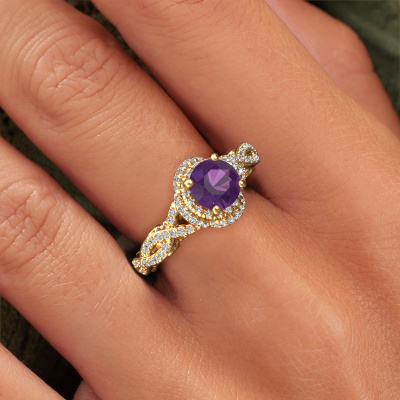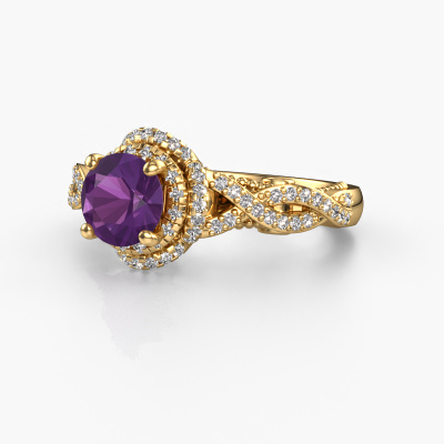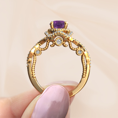 The ring shown above is called the Leora. We call this type of ring a halo ring because it has one centre gemstone and a band that is also pave set with gemstones. The 14 Carat gold engagement ring is set with a round 6.5 mm amethyst centre stone and the band is pave set with lab-grown diamonds. What makes this vintage gold halo ring special are the smaller sized stones embracing the centre stone. This gorgeous engagement ring is called a halo ring because the smaller gemstones give the centre stone a halo of surrounding light. In order for the smaller stones to enhance the centre stone, they have to be placed so there is no interference of light. And that's when our expert goldsmiths come in. Each individual stone is carefully set in the ring by hand. During manufacturing, light fall is constantly monitored to make sure the special halo is still visible. In the end you get a unique engagement ring, with a amethyst of your choosing at its centre. You can imagine the effect of a ring of such significance when you give it to her on her special day to shine. By using our modern techniques, we can design and customize the finest quality jewels with the utmost care for you. Our engagement rings are always priced 30 percent lower than other jewellers. We make engagement rings to order so we don't have to maintain a large stock. If you have a certain budget, we are more than happy to advice you accordingly.Our designers and goldsmiths work together each day, creating new jewels. Perhaps you have found a nice vintage engagement ring somewhere, which can be used to customize your unique ring. Please feel free to contact us. We will make you an offer, based on a fair price/ quality ratio, which will amaze you.To make it easier for you, we offer a 30 day return policy. Check our terms and conditions.