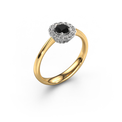 The ring shown above is called the Debi. We call this type of ring a halo ring because it has one centre gemstone and a band that is also pave set with gemstones. The 14 Carat gold engagement ring is set with a round 0.36 crt black diamond centre stone and the band is pave set with diamonds. What makes this classic gold halo ring special are the smaller sized stones embracing the centre stone. This gorgeous engagement ring is called a halo ring because the smaller gemstones give the centre stone a halo of surrounding light. In order for the smaller stones to enhance the centre stone, they have to be placed so there is no interference of light. And that's when our expert goldsmiths come in. Each individual stone is carefully set in the ring by hand. During manufacturing, light fall is constantly monitored to make sure the special halo is still visible. In the end you get a unique engagement ring, with a black diamond of your choosing at its centre. You can imagine the effect of a ring of such significance when you give it to her on her special day to shine. Because we design and deliver our own rings, we can offer you a engagement ring at a price you won't find anywhere else. A ring is made to order, which helps prevent excess supplies, so we can make you a great price offer. We understand it feels risky, buying your engagement ring online, but we will gladly assist in the designing process, taking your budget into consideration.Our team adds new designs to our online collection daily. Our designers and goldsmiths work together in creating the best design. We strive to offer a diverse collection of jewels. Perhaps you have a specific jewel design in mind. One you came across somewhere. Please contact us for a free consultation. We will make you an offer, based on a fair price/ quality ratio, that will baffle you.To make it easier for you, we offer a 30 day return policy. Check our terms and conditions.