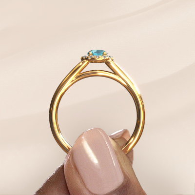 The ring shown above is called the Verla rnd 1. We call this type of ring a halo ring because it has one centre gemstone and a band that is also pave set with gemstones. The 14 Carat gold engagement ring is set with a round 4.7 mm blue topaz centre stone and the band is pave set with diamonds. What makes this classic gold halo ring special are the smaller sized stones embracing the centre stone. This gorgeous engagement ring is called a halo ring because the smaller gemstones give the centre stone a halo of surrounding light. In order for the smaller stones to enhance the centre stone, they have to be placed so there is no interference of light. And that's when our expert goldsmiths come in. Each individual stone is carefully set in the ring by hand. During manufacturing, light fall is constantly monitored to make sure the special halo is still visible. In the end you get a unique engagement ring, with a blue topaz of your choosing at its centre. You can imagine the effect of a ring of such significance when you give it to her on her special day to shine. By using a combination of the latest modern techniques, combined with ancient crafting, we can make all our engagement rings in our own studio. Each jewel is made to order. This is advantageous because we can offer you a price you won't find anywhere else.Our team adds new designs to our online collection daily. Our designers and goldsmiths work together in creating the best design. We strive to offer a diverse collection of jewels. Perhaps you have a specific jewel design in mind. One you came across somewhere. Please contact us for a free consultation. We will make you an offer, based on a fair price/ quality ratio, that will baffle you.To make it easier for you, we offer a 30 day return policy. Check our terms and conditions.