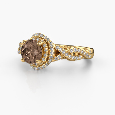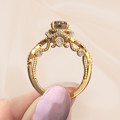 The ring shown above is called the Leora. We call this type of ring a halo ring because it has one centre gemstone and a band that is also pave set with gemstones. The 14 Carat gold engagement ring is set with a round 1.00 crt brown diamond centre stone and the band is pave set with lab-grown diamonds. What makes this vintage gold halo ring special are the smaller sized stones embracing the centre stone. This gorgeous engagement ring is called a halo ring because the smaller gemstones give the centre stone a halo of surrounding light. In order for the smaller stones to enhance the centre stone, they have to be placed so there is no interference of light. And that's when our expert goldsmiths come in. Each individual stone is carefully set in the ring by hand. During manufacturing, light fall is constantly monitored to make sure the special halo is still visible. In the end you get a unique engagement ring, with a brown diamond of your choosing at its centre. You can imagine the effect of a ring of such significance when you give it to her on her special day to shine. By using our modern techniques, we can design and customize the finest quality jewels with the utmost care for you. Our engagement rings are always priced 30 percent lower than other jewellers. We make engagement rings to order so we don't have to maintain a large stock. If you have a certain budget, we are more than happy to advice you accordingly.Our designers and goldsmiths work together each day, creating new jewels. Perhaps you have found a nice vintage engagement ring somewhere, which can be used to customize your unique ring. Please feel free to contact us. We will make you an offer, based on a fair price/ quality ratio, which will amaze you.To make it easier for you, we offer a 30 day return policy. Check our terms and conditions.