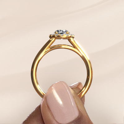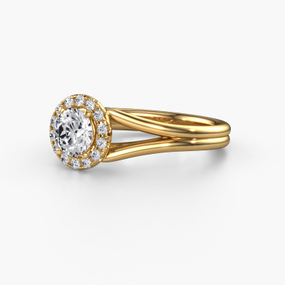 The ring shown above is called the Verla rnd 1. We call this type of ring a halo ring because it has one centre gemstone and a band that is also pave set with gemstones. The 14 Carat gold engagement ring is set with a round 0.70 crt diamond centre stone and the band is pave set with diamonds. What makes this classic gold halo ring special are the smaller sized stones embracing the centre stone. This gorgeous engagement ring is called a halo ring because the smaller gemstones give the centre stone a halo of surrounding light. In order for the smaller stones to enhance the centre stone, they have to be placed so there is no interference of light. And that's when our expert goldsmiths come in. Each individual stone is carefully set in the ring by hand. During manufacturing, light fall is constantly monitored to make sure the special halo is still visible. In the end you get a unique engagement ring, with a diamond of your choosing at its centre. You can imagine the effect of a ring of such significance when you give it to her on her special day to shine. By using a combination of the latest modern techniques, combined with ancient crafting, we can make all our engagement rings in our own studio. Each jewel is made to order. This is advantageous because we can offer you a price you won't find anywhere else.Our team adds new designs to our online collection daily. Our designers and goldsmiths work together in creating the best design. We strive to offer a diverse collection of jewels. Perhaps you have a specific jewel design in mind. One you came across somewhere. Please contact us for a free consultation. We will make you an offer, based on a fair price/ quality ratio, that will baffle you.To make it easier for you, we offer a 30 day return policy. Check our terms and conditions.