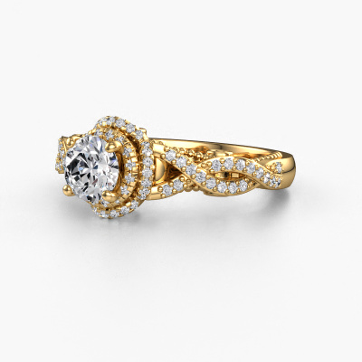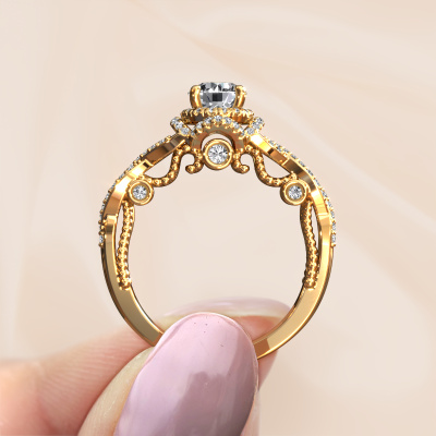 The ring shown above is called the Leora. We call this type of ring a halo ring because it has one centre gemstone and a band that is also pave set with gemstones. The 14 Carat gold engagement ring is set with a round 0.70 crt diamond centre stone and the band is pave set with lab-grown diamonds. What makes this vintage gold halo ring special are the smaller sized stones embracing the centre stone. This gorgeous engagement ring is called a halo ring because the smaller gemstones give the centre stone a halo of surrounding light. In order for the smaller stones to enhance the centre stone, they have to be placed so there is no interference of light. And that's when our expert goldsmiths come in. Each individual stone is carefully set in the ring by hand. During manufacturing, light fall is constantly monitored to make sure the special halo is still visible. In the end you get a unique engagement ring, with a diamond of your choosing at its centre. You can imagine the effect of a ring of such significance when you give it to her on her special day to shine. By using our modern techniques, we can design and customize the finest quality jewels with the utmost care for you. Our engagement rings are always priced 30 percent lower than other jewellers. We make engagement rings to order so we don't have to maintain a large stock. If you have a certain budget, we are more than happy to advice you accordingly.Our designers and goldsmiths work together each day, creating new jewels. Perhaps you have found a nice vintage engagement ring somewhere, which can be used to customize your unique ring. Please feel free to contact us. We will make you an offer, based on a fair price/ quality ratio, which will amaze you.To make it easier for you, we offer a 30 day return policy. Check our terms and conditions.
