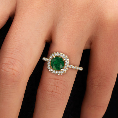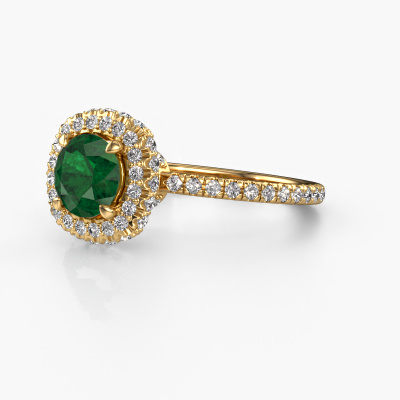The ring shown above is called the Talitha RND. We call this type of ring a halo ring because it has one centre gemstone and a band that is also pave set with gemstones. The 14 Carat gold engagement ring is set with a round 6.5 mm emerald centre stone and the band is pave set with lab-grown diamonds. What makes this exclusive gold halo ring special are the smaller sized stones embracing the centre stone. This gorgeous engagement ring is called a halo ring because the smaller gemstones give the centre stone a halo of surrounding light. In order for the smaller stones to enhance the centre stone, they have to be placed so there is no interference of light. And that's when our expert goldsmiths come in. Each individual stone is carefully set in the ring by hand. During manufacturing, light fall is constantly monitored to make sure the special halo is still visible. In the end you get a unique engagement ring, with a emerald of your choosing at its centre. You can imagine the effect of a ring of such significance when you give it to her on her special day to shine. Are you on a budget? Please feel free to contact us, so we can go discuss your options. We offer our engagement rings at guaranteed best price, because we make them to order. You won't find such a price anywhere else!Our team adds new designs to our online collection daily. Our designers and goldsmiths work together in creating the best design. We strive to offer a diverse collection of jewels. Perhaps you have a specific jewel design in mind. One you came across somewhere. Please contact us for a free consultation. We will make you an offer, based on a fair price/ quality ratio, that will baffle you.To make it easier for you, we offer a 30 day return policy. Check our terms and conditions.