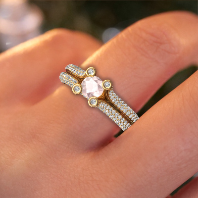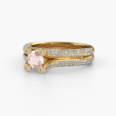 This 14 Carat gold ring is called Stefanie 2 and is set with 5 mm morganite champagne. Does your girlfriend fancy exclusive jewellery? Or would you like to show her that she deserves the finest jewellery? This gold ring is pure craftsmanship, love and passion combined with the latest techniques coming together in perfect harmony. It requires a keen eye, patience and a skilful hand to mould this ring into perfection. Just the job for our expert goldsmith! The morganite champagne set gemstones gives this gold ring an extra glamorous appearance. Customize the style of the split band engagement ring to her liking with a wide variety of precious metals and gemstones which you select. That is how you create a unique ring for the most exclusive woman in your life! This jewel is made just for you by our master goldsmiths in our own studio.After receiving your order, our goldsmiths will passionately start the creative process of making your engagement ring in our own studio. Because we don't have a big stockpile, these costs will not be passed on to you. Our pricing is proof of that! We offer top quality jewels at lowest price, guaranteed.Different styles of new rings are made daily by our team. Perhaps you have found a pavé solitaire engagement ring somewhere. One you would like to give to your loved one. Please feel free to share your thoughts and design with our jewel designers. We would love to turn your design into a unique engagement ring. You can follow the development of your ring design because we use very detailed 3D drawings. On top of that, you can order a dummy of the design. A dummy is a plastic ring, which can be shaped according your ring design. You can try it on and check if the engagement ring is up to standard. We will gladly send you a non-binding offer, based on a fair price/ quality ratio. The offer will baffle you, considering the quality of the ring and gemstones.To make it easier for you, we offer a 30 day return policy. Check our terms and conditions.