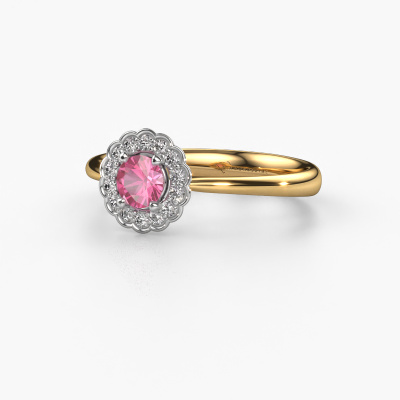 The ring shown above is called the Debi. We call this type of ring a halo ring because it has one centre gemstone and a band that is also pave set with gemstones. The 14 Carat gold engagement ring is set with a round 4.2 mm pink sapphire centre stone and the band is pave set with diamonds. What makes this classic gold halo ring special are the smaller sized stones embracing the centre stone. This gorgeous engagement ring is called a halo ring because the smaller gemstones give the centre stone a halo of surrounding light. In order for the smaller stones to enhance the centre stone, they have to be placed so there is no interference of light. And that's when our expert goldsmiths come in. Each individual stone is carefully set in the ring by hand. During manufacturing, light fall is constantly monitored to make sure the special halo is still visible. In the end you get a unique engagement ring, with a pink sapphire of your choosing at its centre. You can imagine the effect of a ring of such significance when you give it to her on her special day to shine. Because we design and deliver our own rings, we can offer you a engagement ring at a price you won't find anywhere else. A ring is made to order, which helps prevent excess supplies, so we can make you a great price offer. We understand it feels risky, buying your engagement ring online, but we will gladly assist in the designing process, taking your budget into consideration.Our team adds new designs to our online collection daily. Our designers and goldsmiths work together in creating the best design. We strive to offer a diverse collection of jewels. Perhaps you have a specific jewel design in mind. One you came across somewhere. Please contact us for a free consultation. We will make you an offer, based on a fair price/ quality ratio, that will baffle you.To make it easier for you, we offer a 30 day return policy. Check our terms and conditions.
