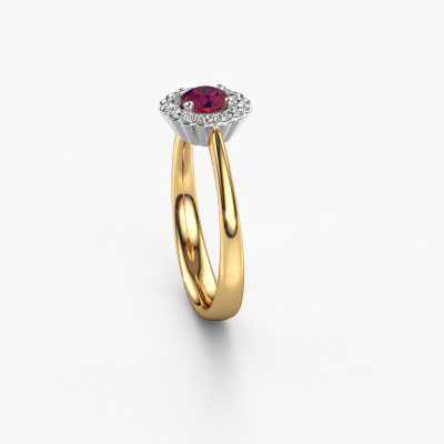 The ring shown above is called the Debi. We call this type of ring a halo ring because it has one centre gemstone and a band that is also pave set with gemstones. The 14 Carat gold engagement ring is set with a round 4.2 mm rhodolite centre stone and the band is pave set with diamonds. What makes this classic gold halo ring special are the smaller sized stones embracing the centre stone. This gorgeous engagement ring is called a halo ring because the smaller gemstones give the centre stone a halo of surrounding light. In order for the smaller stones to enhance the centre stone, they have to be placed so there is no interference of light. And that's when our expert goldsmiths come in. Each individual stone is carefully set in the ring by hand. During manufacturing, light fall is constantly monitored to make sure the special halo is still visible. In the end you get a unique engagement ring, with a rhodolite of your choosing at its centre. You can imagine the effect of a ring of such significance when you give it to her on her special day to shine. Because we design and deliver our own rings, we can offer you a engagement ring at a price you won't find anywhere else. A ring is made to order, which helps prevent excess supplies, so we can make you a great price offer. We understand it feels risky, buying your engagement ring online, but we will gladly assist in the designing process, taking your budget into consideration.Our team adds new designs to our online collection daily. Our designers and goldsmiths work together in creating the best design. We strive to offer a diverse collection of jewels. Perhaps you have a specific jewel design in mind. One you came across somewhere. Please contact us for a free consultation. We will make you an offer, based on a fair price/ quality ratio, that will baffle you.To make it easier for you, we offer a 30 day return policy. Check our terms and conditions.