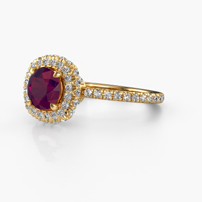 The ring shown above is called the Talitha RND. We call this type of ring a halo ring because it has one centre gemstone and a band that is also pave set with gemstones. The 14 Carat gold engagement ring is set with a round 6.5 mm rhodolite centre stone and the band is pave set with lab-grown diamonds. What makes this exclusive gold halo ring special are the smaller sized stones embracing the centre stone. This gorgeous engagement ring is called a halo ring because the smaller gemstones give the centre stone a halo of surrounding light. In order for the smaller stones to enhance the centre stone, they have to be placed so there is no interference of light. And that's when our expert goldsmiths come in. Each individual stone is carefully set in the ring by hand. During manufacturing, light fall is constantly monitored to make sure the special halo is still visible. In the end you get a unique engagement ring, with a rhodolite of your choosing at its centre. You can imagine the effect of a ring of such significance when you give it to her on her special day to shine. Are you on a budget? Please feel free to contact us, so we can go discuss your options. We offer our engagement rings at guaranteed best price, because we make them to order. You won't find such a price anywhere else!Our team adds new designs to our online collection daily. Our designers and goldsmiths work together in creating the best design. We strive to offer a diverse collection of jewels. Perhaps you have a specific jewel design in mind. One you came across somewhere. Please contact us for a free consultation. We will make you an offer, based on a fair price/ quality ratio, that will baffle you.To make it easier for you, we offer a 30 day return policy. Check our terms and conditions.