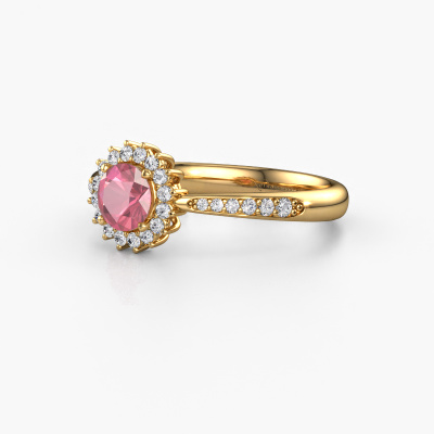 The ring shown above is called the Tilly RND 2. We call this type of ring a cluster ring, the centre gemstone is surrounded by smaller sized stones. This 14 Carat gold version is set with a 5 mm round tourmaline pink centre stone, embraced by smaller diamonds. If you look at this gold cluster engagement ring, you might get the impression that its smaller sized stones collide with the bigger tourmaline pink, so it is shaped like a flower. Therefore this engagement ring is also known as the flower ring. Our artisan goldsmiths get the job done. Each individual stone is carefully set by hand. During manufacturing, light fall is constantly monitored to make sure the special cluster effect is still visible. In the end you get the perfect engagement ring with a radiant tourmaline pink gemstone centrepiece. You can imagine the effect of a ring of such significance when you give tot the love of your life on her special day to shine. After receiving your order, our goldsmiths will start the creative process of making your Tilly RND 2 engagement ring. We don't keep stock. This is advantageous because these costs will not be passed on to you. Therefore, we can offer jewellery at exceptionally low prices.Our team adds new designs to our online collection daily. Our designers and goldsmiths work together in creating the best design. We strive to offer a diverse collection of jewels. Perhaps you have a specific jewel design in mind. One you came across somewhere. Please contact us for a free consultation. We will make you an offer, based on a fair price/ quality ratio, that will baffle you.To make it easier for you, we offer a 30 day return policy. Check our terms and conditions.