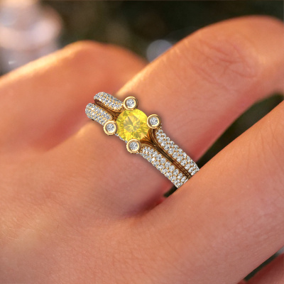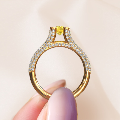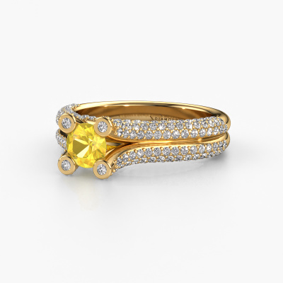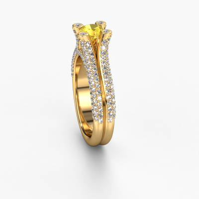 This 14 Carat gold ring is called Stefanie 2 and is set with 5 mm yellow sapphire. Does your girlfriend fancy exclusive jewellery? Or would you like to show her that she deserves the finest jewellery? This gold ring is pure craftsmanship, love and passion combined with the latest techniques coming together in perfect harmony. It requires a keen eye, patience and a skilful hand to mould this ring into perfection. Just the job for our expert goldsmith! The yellow sapphire set gemstones gives this gold ring an extra glamorous appearance. Customize the style of the split band engagement ring to her liking with a wide variety of precious metals and gemstones which you select. That is how you create a unique ring for the most exclusive woman in your life! This jewel is made just for you by our master goldsmiths in our own studio.After receiving your order, our goldsmiths will passionately start the creative process of making your engagement ring in our own studio. Because we don't have a big stockpile, these costs will not be passed on to you. Our pricing is proof of that! We offer top quality jewels at lowest price, guaranteed.Different styles of new rings are made daily by our team. Perhaps you have found a pavé solitaire engagement ring somewhere. One you would like to give to your loved one. Please feel free to share your thoughts and design with our jewel designers. We would love to turn your design into a unique engagement ring. You can follow the development of your ring design because we use very detailed 3D drawings. On top of that, you can order a dummy of the design. A dummy is a plastic ring, which can be shaped according your ring design. You can try it on and check if the engagement ring is up to standard. We will gladly send you a non-binding offer, based on a fair price/ quality ratio. The offer will baffle you, considering the quality of the ring and gemstones.To make it easier for you, we offer a 30 day return policy. Check our terms and conditions.