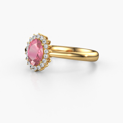 The ring shown above is called the Tilly ovl 1. We call this type of ring a cluster ring, the centre gemstone is surrounded by smaller sized stones. This 14 Carat gold version is set with a 7x5 mm oval tourmaline pink centre stone, embraced by smaller lab-grown diamonds. The classic gold cluster engagement ring stands out because of its shape. Together, the smaller and bigger sized tourmaline pink gemstones form a flower and they appear to collide into one big sparkling gem. This classic engagement ring is also known as the flower ring. Our expert Goldsmiths make sure the smaller lab-grown diamonds stones are set identically so there is no light interference in the tourmaline pink but unity instead. With perfect precision and a skilful hand each tourmaline pink is set in the ring. During manufacturing, it is constantly monitored to make sure light reflects flawlessly. This results in a unique engagement ring, with a radiant tourmaline pink at its centre. A lovely, meaningful gift to bestow upon the love of your life. By using a combination of the latest modern techniques, combined with ancient crafting, we can make all our engagement rings in our own studio. Each jewel is made to order. This is advantageous because we can offer you a price you won't find anywhere else.Do you have a specific ring in mind? One you came across somewhere. Please feel free to tell us your wishes and we will turn your design into a unique engagement ring. You can follow the development of your ring design because we use 3D drawings. This gives you a realistic preview of your design. We will gladly send you a non-binding offer, based on a fair price/ quality ratio. It will amaze you.To make it easier for you, we offer a 30 day return policy. Check our terms and conditions.