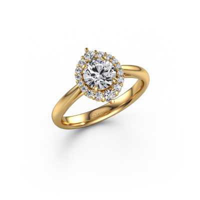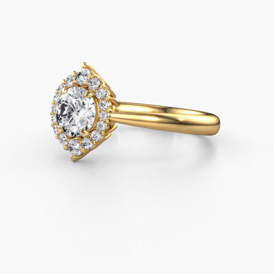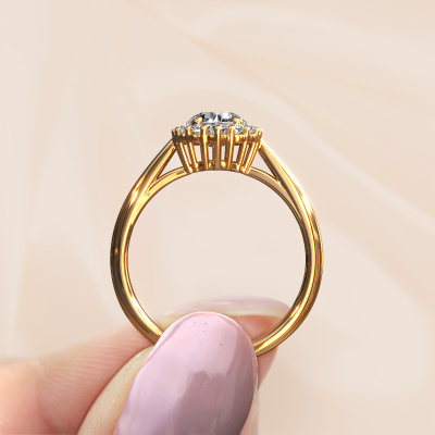 The ring shown above is called the Tora. We call this type of ring a cluster ring, the centre gemstone is surrounded by smaller sized stones. This 14 Carat gold version is set with a 0.70 crt round diamond centre stone, embraced by smaller lab-grown diamonds. The classic gold cluster engagement ring stands out because of its shape. Together, the smaller and bigger sized diamond gemstones form a flower and they appear to collide into one big sparkling gem. This classic engagement ring is also known as the flower ring. Our expert Goldsmiths make sure the smaller lab-grown diamonds stones are set identically so there is no light interference in the diamond but unity instead. With perfect precision and a skilful hand each diamond is set in the ring. During manufacturing, it is constantly monitored to make sure light reflects flawlessly. This results in a unique engagement ring, with a radiant diamond at its centre. A lovely, meaningful gift to bestow upon the love of your life. By using a combination of the latest modern techniques, combined with ancient crafting, we can make all our engagement rings in our own studio. Each jewel is made to order. This is advantageous because we can offer you a price you won't find anywhere else.Have you found a specific engagement ring somewhere which you would like to give to your loved one? Please feel free to express your wishes to our jewel designers because we would be honoured to turn your design into a classic engagement ring. You can follow the development of your ring design because we use 3D drawings. This gives you a realistic preview of how your design will look. You can also preorder a dummy. A dummy is a plastic ring, which can be shaped according your ring design. You can try it on and check if its width and size are suitable for you. We will gladly send you a non-binding offer, based on a fair price/ quality ratio. It will amaze you, considering the quality of the ring and gemstones.To make it easier for you, we offer a 30 day return policy. Check our terms and conditions.