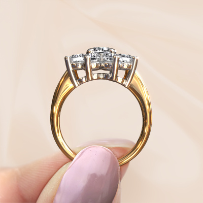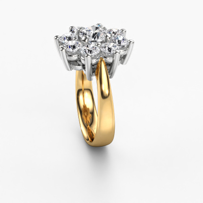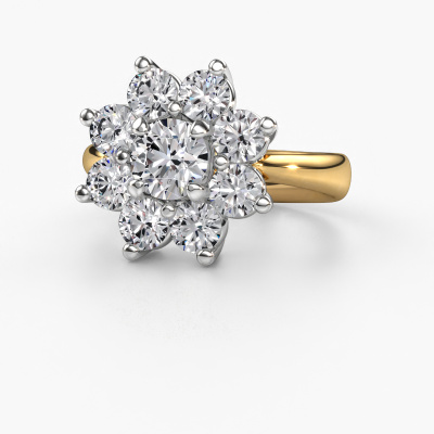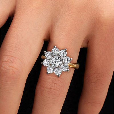 The ring shown above is called the Camille 1. We call this type of ring a cluster ring, the centre gemstone is surrounded by smaller sized stones. This 14 Carat gold version is set with a 0.70 crt round lab grown diamond centre stone, embraced by smaller diamonds. The traditional gold cluster engagement ring stands out because of its shape. Together, the smaller and bigger sized lab grown diamond gemstones form a flower and they appear to collide into one big sparkling gem. This traditional engagement ring is also known as the flower ring. Our expert Goldsmiths make sure the smaller diamonds stones are set identically so there is no light interference in the lab grown diamond but unity instead. With perfect precision and a skilful hand each lab grown diamond is set in the ring. During manufacturing, it is constantly monitored to make sure light reflects flawlessly. This results in a unique engagement ring, with a radiant lab grown diamond at its centre. A lovely, meaningful gift to bestow upon the love of your life. By using our modern techniques, we can design and customize the finest quality jewels with the utmost care for you. Our engagement rings are always priced 30 percent lower than other jewellers. We make engagement rings to order so we don't have to maintain a large stock. If you have a certain budget, we are more than happy to advice you accordingly.Our team adds new designs to our online collection daily. Our designers and goldsmiths work together in creating the best design. We strive to offer a diverse collection of jewels. Perhaps you have a specific jewel design in mind. One you came across somewhere. Please contact us for a free consultation. We will make you an offer, based on a fair price/ quality ratio, that will baffle you.To make it easier for you, we offer a 30 day return policy. Check our terms and conditions.