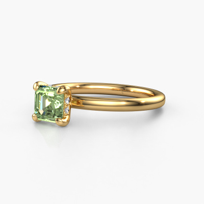 The ring shown above is called the Simone ASC 2. We call this type of ring a pavé solitaire ring because it has one centre gemstone and a band that is also pave set with gemstones. This engagement ring is made in 14 Carat gold set with a 5.5 mm asscher green lab grown diamond, and pave set lab-grown diamonds at the sides. Each piece of jewellery is unique in every way! Simply customize to your liking,This exclusive gold pavé solitaire engagement ring has an exquisite asscher green lab grown diamond centre stone. To further accentuate the centre stone, the band is set full with more lab-grown diamonds. Its open prong setting allows light to strike the green lab grown diamond from various angles and this adds sparkle to your green lab grown diamond ring. The photo shown above depicts the goldsmith's carefully handcrafted details of the ring. The high positioning of the centre stone is truly eye-catching. The perfect engagement ring for the crown jewel of your life!Because we design and deliver our own rings, we can offer you a engagement ring at a price you won't find anywhere else. A ring is made to order, which helps prevent excess supplies, so we can make you a great price offer. We understand it feels risky, buying your engagement ring online, but we will gladly assist in the designing process, taking your budget into consideration.Do you have a specific ring in mind? One you came across somewhere. Please feel free to tell us your wishes and we will turn your design into a unique engagement ring. You can follow the development of your ring design because we use 3D drawings. This gives you a realistic preview of your design. We will gladly send you a non-binding offer, based on a fair price/ quality ratio. It will amaze you.To make it easier for you, we offer a 30 day return policy. Check our terms and conditions.