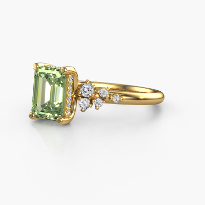 The ring shown above is called the Emma EME. We call this type of ring a pavé solitaire ring because it has one centre gemstone and a band that is also pave set with gemstones. This engagement ring is made in 14 Carat gold set with a 8x6 mm emerald cut green lab grown diamond, and pave set lab-grown diamonds at the sides. Each piece of jewellery is made with passion and love by one of our master goldsmiths.This fantasy gold pavé solitaire engagement ring has an exquisite emerald cut green lab grown diamond centre stone. To further accentuate the centre stone, the band is set full with more lab-grown diamonds. Its open prong setting allows light to strike the green lab grown diamond from various angles and this adds sparkle to your green lab grown diamond ring. The photo shown above depicts the goldsmith's carefully handcrafted details of the ring. The high positioning of the centre stone is truly eye-catching. The perfect engagement ring for the crown jewel of your life!After receiving your order, our goldsmiths will passionately start the creative process of making your engagement ring in our own studio. Because we don't have a big stockpile, these costs will not be passed on to you. Our pricing is proof of that! We offer top quality jewels at lowest price, guaranteed.Our team adds new designs to our online collection daily. Our designers and goldsmiths work together in creating the best design. We strive to offer a diverse collection of jewels. Perhaps you have a specific jewel design in mind. One you came across somewhere. Please contact us for a free consultation. We will make you an offer, based on a fair price/ quality ratio, that will baffle you.To make it easier for you, we offer a 30 day return policy. Check our terms and conditions.