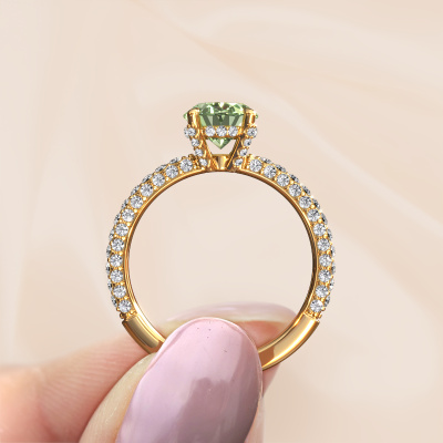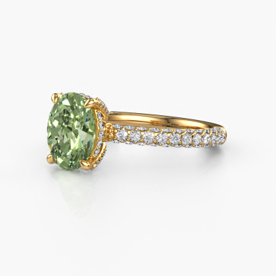 The ring shown above is called the Saskia 2 ovl. We call this type of ring a pavé solitaire ring because it has one centre gemstone and a band that is also pave set with gemstones. The 14 Carat gold engagement ring is set with a oval 9x7 mm green lab grown diamond centre stone and the band is pave set with lab grown diamond gemstones. Each jewel is made just for you by our master goldsmiths in our own studio.This exclusive gold pavé solitaire engagement ring has an exquisite oval green lab grown diamond centre stone. To further accentuate the centre stone, the band is fully set with more lab-grown diamonds. Its open prong setting allows light to strike the green lab grown diamond from various angles and this adds sparkle to your green lab grown diamond ring. The photo shown above depicts the goldsmith's carefully handcrafted details of the ring. The high positioning of the centre stone is truly eye-catching. The perfect engagement ring for the crown jewel of your life! After receiving your order, our goldsmiths will passionately start the creative process of making your engagement ring in our own studio. Because we don't have a big stockpile, these costs will not be passed on to you. Our pricing is proof of that! We offer top quality jewels at lowest price, guaranteed.Have you found a specific engagement ring somewhere which you would like to give to your loved one? Please feel free to express your wishes to our jewel designers because we would be honoured to turn your design into a exclusive engagement ring. You can follow the development of your ring design because we use 3D drawings. This gives you a realistic preview of how your design will look. You can also preorder a dummy. A dummy is a plastic ring, which can be shaped according your ring design. You can try it on and check if its width and size are suitable for you. We will gladly send you a non-binding offer, based on a fair price/ quality ratio. It will amaze you, considering the quality of the ring and gemstones.To make it easier for you, we offer a 30 day return policy. Check our terms and conditions.