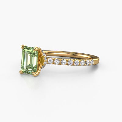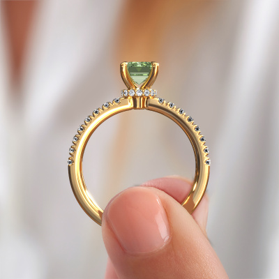 The ring shown above is called the Crystal EME 4. We call this type of ring a pavé solitaire ring because it has one centre gemstone and a band that is also pave set with gemstones. The 14 Carat gold engagement ring is set with a emerald cut 7x5 mm green lab grown diamond centre stone and the band is pave set with lab grown diamond gemstones. Each jewel is created to add sparkle to your finger, each jewel is lovingly made by hand by our goldsmiths.This fashionable gold pavé solitaire engagement ring has an exquisite emerald cut green lab grown diamond centre stone. To further accentuate the centre stone, the band is fully set with more lab-grown diamonds. Its open prong setting allows light to strike the green lab grown diamond from various angles and this adds sparkle to your green lab grown diamond ring. The photo shown above depicts the goldsmith's carefully handcrafted details of the ring. The high positioning of the centre stone is truly eye-catching. The perfect engagement ring for the crown jewel of your life! After receiving your order, our goldsmiths will passionately start the creative process of making your engagement ring in our own studio. Because we don't have a big stockpile, these costs will not be passed on to you. Our pricing is proof of that! We offer top quality jewels at lowest price, guaranteed.Our team adds new designs to our online collection daily. Our designers and goldsmiths work together in creating the best design. We strive to offer a diverse collection of jewels. Perhaps you have a specific jewel design in mind. One you came across somewhere. Please contact us for a free consultation. We will make you an offer, based on a fair price/ quality ratio, that will baffle you.To make it easier for you, we offer a 30 day return policy. Check our terms and conditions.