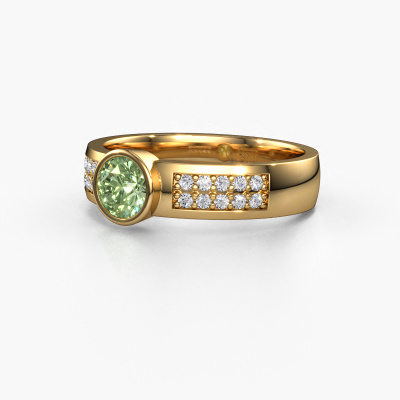 The ring shown above is called the Ise 3. We call this type of ring a pavé solitaire ring because it has one centre gemstone and a band that is also pave set with gemstones. The 14 Carat gold engagement ring is set with a round 4.7 mm green lab grown diamond centre stone and the band is pave set with diamond gemstones. Each jewel is made just for you by our master goldsmiths in our own studio.This modern gold pavé solitaire engagement ring has an exquisite round green lab grown diamond centre stone. To further accentuate the centre stone, the band is fully set with more diamonds. Its open prong setting allows light to strike the green lab grown diamond from various angles and this adds sparkle to your green lab grown diamond ring. The photo shown above depicts the goldsmith's carefully handcrafted details of the ring. The high positioning of the centre stone is truly eye-catching. The perfect engagement ring for the crown jewel of your life! Because we design and deliver our own rings, we can offer you a engagement ring at a price you won't find anywhere else. A ring is made to order, which helps prevent excess supplies, so we can make you a great price offer. We understand it feels risky, buying your engagement ring online, but we will gladly assist in the designing process, taking your budget into consideration.Our team adds new designs to our online collection daily. Our designers and goldsmiths work together in creating the best design. We strive to offer a diverse collection of jewels. Perhaps you have a specific jewel design in mind. One you came across somewhere. Please contact us for a free consultation. We will make you an offer, based on a fair price/ quality ratio, that will baffle you.To make it easier for you, we offer a 30 day return policy. Check our terms and conditions.