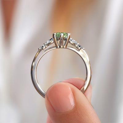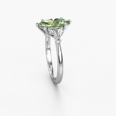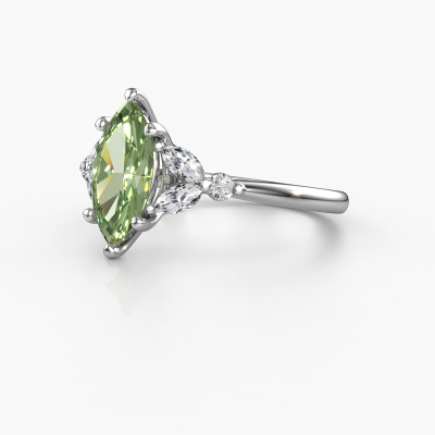 The ring shown above is called the Megan MRQ. We call this type of ring a pavé solitaire ring because it has one centre gemstone and a band that is also pave set with gemstones. This engagement ring is made in platinum set with a 11x5.5 mm marquise green lab grown diamond, and pave set lab-grown diamonds at the sides. Each piece of jewellery is made with passion and love by one of our master goldsmiths.This fantasy platinum pavé solitaire engagement ring has an exquisite marquise green lab grown diamond centre stone. To further accentuate the centre stone, the band is set full with more lab-grown diamonds. Its open prong setting allows light to strike the green lab grown diamond from various angles and this adds sparkle to your green lab grown diamond ring. The photo shown above depicts the goldsmith's carefully handcrafted details of the ring. The high positioning of the centre stone is truly eye-catching. The perfect engagement ring for the crown jewel of your life![bestp1v_long]Have you found a specific engagement ring somewhere which you would like to give to your loved one? Please feel free to express your wishes to our jewel designers because we would be honoured to turn your design into a fantasy engagement ring. You can follow the development of your ring design because we use 3D drawings. This gives you a realistic preview of how your design will look. You can also preorder a dummy. A dummy is a plastic ring, which can be shaped according your ring design. You can try it on and check if its width and size are suitable for you. We will gladly send you a non-binding offer, based on a fair price/ quality ratio. It will amaze you, considering the quality of the ring and gemstones.To make it easier for you, we offer a 30 day return policy. Check our terms and conditions.