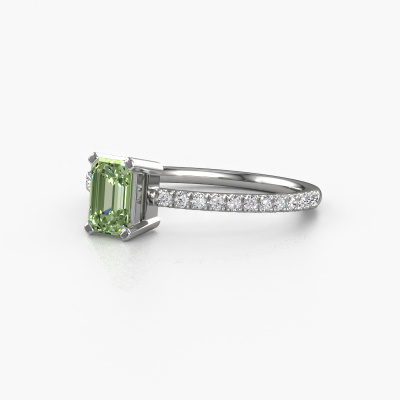 The ring shown above is called the Denita 2 EME. We call this type of ring a pavé solitaire ring because it has one centre gemstone and a band that is also pave set with gemstones. This engagement ring is made in platinum set with a 6x4 mm emerald cut green lab grown diamond, and pave set diamonds at the sides. Each piece of jewellery is made just for you by our master goldsmiths in our own studio.This traditional platinum pavé solitaire engagement ring has an exquisite emerald cut green lab grown diamond centre stone. To further accentuate the centre stone, the band is set full with more diamonds. Its open prong setting allows light to strike the green lab grown diamond from various angles and this adds sparkle to your green lab grown diamond ring. The photo shown above depicts the goldsmith's carefully handcrafted details of the ring. The high positioning of the centre stone is truly eye-catching. The perfect engagement ring for the crown jewel of your life!Are you on a budget? Please feel free to contact us, so we can go discuss your options. We offer our engagement rings at guaranteed best price, because we make them to order. You won't find such a price anywhere else!Our team adds new designs to our online collection daily. Our designers and goldsmiths work together in creating the best design. We strive to offer a diverse collection of jewels. Perhaps you have a specific jewel design in mind. One you came across somewhere. Please contact us for a free consultation. We will make you an offer, based on a fair price/ quality ratio, that will baffle you.To make it easier for you, we offer a 30 day return policy. Check our terms and conditions.