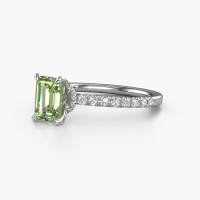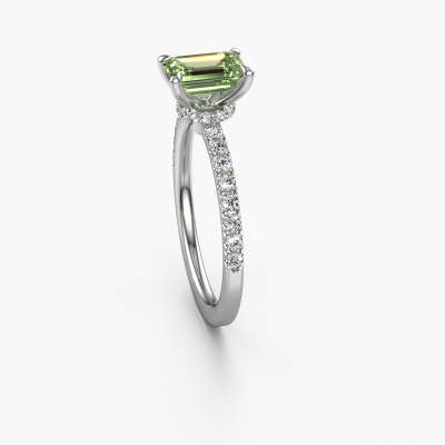 The ring shown above is called the Crystal EME 4. We call this type of ring a pavé solitaire ring because it has one centre gemstone and a band that is also pave set with gemstones. The platinum engagement ring is set with a emerald cut 7x5 mm green lab grown diamond centre stone and the band is pave set with lab grown diamond gemstones. Each jewel is created to add sparkle to your finger, each jewel is lovingly made by hand by our goldsmiths.This fashionable platinum pavé solitaire engagement ring has an exquisite emerald cut green lab grown diamond centre stone. To further accentuate the centre stone, the band is fully set with more lab-grown diamonds. Its open prong setting allows light to strike the green lab grown diamond from various angles and this adds sparkle to your green lab grown diamond ring. The photo shown above depicts the goldsmith's carefully handcrafted details of the ring. The high positioning of the centre stone is truly eye-catching. The perfect engagement ring for the crown jewel of your life! After receiving your order, our goldsmiths will passionately start the creative process of making your engagement ring in our own studio. Because we don't have a big stockpile, these costs will not be passed on to you. Our pricing is proof of that! We offer top quality jewels at lowest price, guaranteed.Our team adds new designs to our online collection daily. Our designers and goldsmiths work together in creating the best design. We strive to offer a diverse collection of jewels. Perhaps you have a specific jewel design in mind. One you came across somewhere. Please contact us for a free consultation. We will make you an offer, based on a fair price/ quality ratio, that will baffle you.To make it easier for you, we offer a 30 day return policy. Check our terms and conditions.