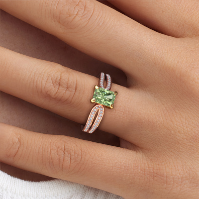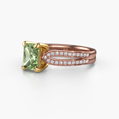 The ring shown above is called the Antonia rad 2. We call this type of ring a pavé solitaire ring because it has one centre gemstone and a band that is also pave set with gemstones. The 14 Carat rose gold engagement ring is set with a radiant 7x5 mm green lab grown diamond centre stone and the band is pave set with diamond gemstones. Each jewel is made just for you by our master goldsmiths in our own studio.This chic rose gold pavé solitaire engagement ring has an exquisite radiant green lab grown diamond centre stone. To further accentuate the centre stone, the band is fully set with more diamonds. Its open prong setting allows light to strike the green lab grown diamond from various angles and this adds sparkle to your green lab grown diamond ring. The photo shown above depicts the goldsmith's carefully handcrafted details of the ring. The high positioning of the centre stone is truly eye-catching. The perfect engagement ring for the crown jewel of your life! Because we design and deliver our own rings, we can offer you a engagement ring at a price you won't find anywhere else. A ring is made to order, which helps prevent excess supplies, so we can make you a great price offer. We understand it feels risky, buying your engagement ring online, but we will gladly assist in the designing process, taking your budget into consideration.Our team adds new designs to our online collection daily. Our designers and goldsmiths work together in creating the best design. We strive to offer a diverse collection of jewels. Perhaps you have a specific jewel design in mind. One you came across somewhere. Please contact us for a free consultation. We will make you an offer, based on a fair price/ quality ratio, that will baffle you.To make it easier for you, we offer a 30 day return policy. Check our terms and conditions.