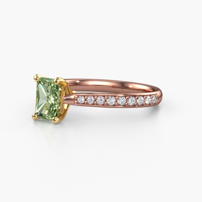 The ring shown above is called the Mignon rad 2. We call this type of ring a pavé solitaire ring because it has one centre gemstone and a band that is also pave set with gemstones. The 14 Carat rose gold engagement ring is set with a radiant 6.5x4.5 mm green lab grown diamond centre stone and the band is pave set with diamond gemstones. Each jewel is unique in every way! Simply customize to your liking,This traditional rose gold pavé solitaire engagement ring has an exquisite radiant green lab grown diamond centre stone. To further accentuate the centre stone, the band is fully set with more diamonds. Its open prong setting allows light to strike the green lab grown diamond from various angles and this adds sparkle to your green lab grown diamond ring. The photo shown above depicts the goldsmith's carefully handcrafted details of the ring. The high positioning of the centre stone is truly eye-catching. The perfect engagement ring for the crown jewel of your life! Are you on a budget? Please feel free to contact us, so we can go discuss your options. We offer our engagement rings at guaranteed best price, because we make them to order. You won't find such a price anywhere else!Have you found a specific engagement ring somewhere which you would like to give to your loved one? Please feel free to express your wishes to our jewel designers because we would be honoured to turn your design into a traditional engagement ring. You can follow the development of your ring design because we use 3D drawings. This gives you a realistic preview of how your design will look. You can also preorder a dummy. A dummy is a plastic ring, which can be shaped according your ring design. You can try it on and check if its width and size are suitable for you. We will gladly send you a non-binding offer, based on a fair price/ quality ratio. It will amaze you, considering the quality of the ring and gemstones.To make it easier for you, we offer a 30 day return policy. Check our terms and conditions.