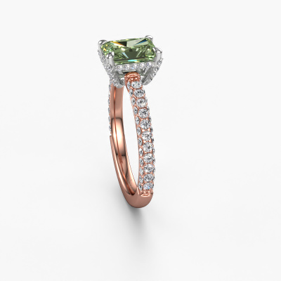 The ring shown above is called the Saskia rad 2. We call this type of ring a pavé solitaire ring because it has one centre gemstone and a band that is also pave set with gemstones. The 14 Carat rose gold engagement ring is set with a radiant 7.5x5.5 mm green lab grown diamond centre stone and the band is pave set with lab grown diamond gemstones. Each jewel is made just for you, with attention to detail and design.This exclusive rose gold pavé solitaire engagement ring has an exquisite radiant green lab grown diamond centre stone. To further accentuate the centre stone, the band is fully set with more lab-grown diamonds. Its open prong setting allows light to strike the green lab grown diamond from various angles and this adds sparkle to your green lab grown diamond ring. The photo shown above depicts the goldsmith's carefully handcrafted details of the ring. The high positioning of the centre stone is truly eye-catching. The perfect engagement ring for the crown jewel of your life! Because we design and deliver our own rings, we can offer you a engagement ring at a price you won't find anywhere else. A ring is made to order, which helps prevent excess supplies, so we can make you a great price offer. We understand it feels risky, buying your engagement ring online, but we will gladly assist in the designing process, taking your budget into consideration.Our team adds new designs to our online collection daily. Our designers and goldsmiths work together in creating the best design. We strive to offer a diverse collection of jewels. Perhaps you have a specific jewel design in mind. One you came across somewhere. Please contact us for a free consultation. We will make you an offer, based on a fair price/ quality ratio, that will baffle you.To make it easier for you, we offer a 30 day return policy. Check our terms and conditions.