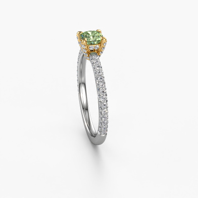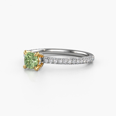 The ring shown above is called the Saskia 2 cus. We call this type of ring a pavé solitaire ring because it has one centre gemstone and a band that is also pave set with gemstones. The 14 Carat white gold engagement ring is set with a cushion 4.5 mm green lab grown diamond centre stone and the band is pave set with lab grown diamond gemstones. Each jewel is made just for you, with attention to detail and design.This contemporary white gold pavé solitaire engagement ring has an exquisite cushion green lab grown diamond centre stone. To further accentuate the centre stone, the band is fully set with more lab-grown diamonds. Its open prong setting allows light to strike the green lab grown diamond from various angles and this adds sparkle to your green lab grown diamond ring. The photo shown above depicts the goldsmith's carefully handcrafted details of the ring. The high positioning of the centre stone is truly eye-catching. The perfect engagement ring for the crown jewel of your life! Are you on a budget? Please feel free to contact us, so we can go discuss your options. We offer our engagement rings at guaranteed best price, because we make them to order. You won't find such a price anywhere else!Our designers and goldsmiths work together each day, creating new jewels. Perhaps you have found a nice contemporary engagement ring somewhere, which can be used to customize your unique ring. Please feel free to contact us. We will make you an offer, based on a fair price/ quality ratio, which will amaze you.To make it easier for you, we offer a 30 day return policy. Check our terms and conditions.