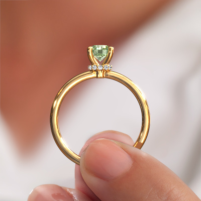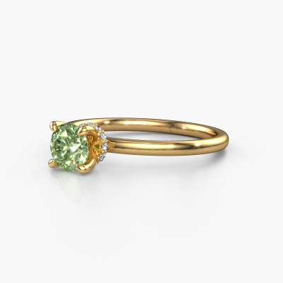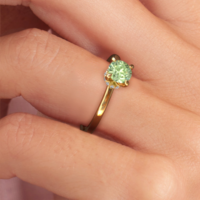 The ring shown above is called the Crystal RND 3, we call this a solitaire ring because it contains a single gemstone. The engagement ring is made in 14 Carat gold and has a round green lab grown diamond of 5.5 mm. The cool thing about our configurator is that you can compile your own piece of jewellery, into a completely personalized one. This solitaire ring is crafted in the precious metals gold with gold, but of course you are free to pick your own colours. Each piece of jewellery is made with passion and love by one of our master goldsmiths.The solitaire ring is a special type of engagement ring. Its open prong setting allows light to strike the gemstone from various angles. This classic engagement ring is a stunning eye-catcher because of the high positioning of the gemstone. In order for you to commemorate your proposal with a unique ring, we carefully adorn this solitaire ring by hand. The love of your life deserves nothing but the best. By using a combination of the latest modern techniques, combined with ancient crafting, we can make all our engagement rings in our own studio. Each jewel is made to order. This is advantageous because we can offer you a price you won't find anywhere else.Different styles of new rings are made daily by our team. Perhaps you have found a solitaire engagement ring somewhere. One you would like to give to your loved one. Please feel free to share your thoughts and design with our jewel designers. We would love to turn your design into a classic engagement ring. You can follow the development of your ring design because we use very detailed 3D drawings. On top of that, you can order a dummy of the design. A dummy is a plastic ring, which can be shaped according your ring design. You can try it on and check if the engagement ring is up to standard. We will gladly send you a non-binding offer, based on a fair price/ quality ratio. The offer will baffle you, considering the quality of the ring and gemstones.To make it easier for you, we offer a 30 day return policy. Check our terms and conditions.