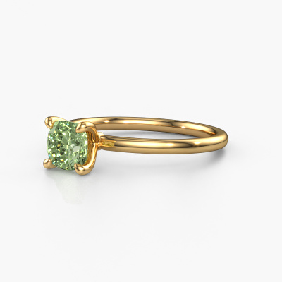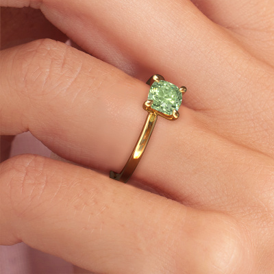 The ring shown above is called the Crystal CUS 1, we call this a solitaire ring because it contains a single gemstone. The engagement ring is made in 14 Carat gold and has a cushion green lab grown diamond of 5.5 mm. The cool thing about our configurator is that you can compile your own piece of jewellery, into a completely personalized one. This solitaire ring is crafted in the precious metals gold with gold, but of course you are free to pick your own colours. Each piece of jewellery is made with passion and love by one of our master goldsmiths.The solitaire ring is a special type of engagement ring. Its open prong setting allows light to strike the gemstone from various angles. This contemporary engagement ring is a stunning eye-catcher because of the high positioning of the gemstone. In order for you to commemorate your proposal with a unique ring, we carefully adorn this solitaire ring by hand. The love of your life deserves nothing but the best. Because we design and deliver our own rings, we can offer you a engagement ring at a price you won't find anywhere else. A ring is made to order, which helps prevent excess supplies, so we can make you a great price offer. We understand it feels risky, buying your engagement ring online, but we will gladly assist in the designing process, taking your budget into consideration.Our team adds new designs to our online collection daily. Our designers and goldsmiths work together in creating the best design. We strive to offer a diverse collection of jewels. Perhaps you have a specific jewel design in mind. One you came across somewhere. Please contact us for a free consultation. We will make you an offer, based on a fair price/ quality ratio, that will baffle you.To make it easier for you, we offer a 30 day return policy. Check our terms and conditions.