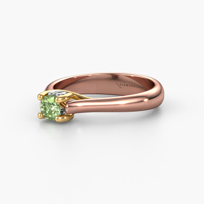 The ring shown above is called the Nisa, we call this a solitaire ring because it contains a single gemstone. The engagement ring is made in 14 Carat rose gold and has a round green lab grown diamond of 4.2 mm. The cool thing about our configurator is that you can compile your own piece of jewellery, into a completely personalized one. This solitaire ring is crafted in the precious metals rose gold with gold, but of course you are free to pick your own colours. Each piece of jewellery is made by a team of passionate goldsmiths and jewel designers. This will make your crown jewel truly eye-catching.The solitaire ring is a special type of engagement ring. Its open prong setting allows light to strike the gemstone from various angles. This unique engagement ring is a stunning eye-catcher because of the high positioning of the gemstone. In order for you to commemorate your proposal with a unique ring, we carefully adorn this solitaire ring by hand. The love of your life deserves nothing but the best.