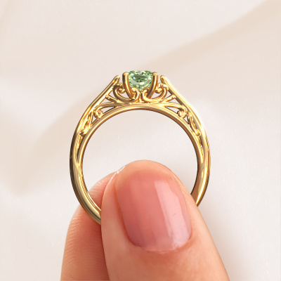 This 14 Carat gold ring is called Shannon cus and is set with 5 mm green lab grown diamond. What is it that makes your relationship unique? What is it about her that makes you want to bend down on one knee? The unique bond between the two of you is emphasized by an equally unique ring. A one of a kind ajour solitaire engagement ring made especially for her. That is why this Celtic ring fits her like a glove. Each specific detail of this ajour gold green lab grown diamond set engagement ring is hand-picked, crafted and polished by our expert goldsmith. The result is an exquisite ring, unique and perfectly crafted to perfection. That is what our expert Goldsmiths strive for. This jewel is made just for you, with attention to detail and design.By using our modern techniques, we can design and customize the finest quality jewels with the utmost care for you. Our engagement rings are always priced 30 percent lower than other jewellers. We make engagement rings to order so we don't have to maintain a large stock. If you have a certain budget, we are more than happy to advice you accordingly.Our team adds new designs to our online collection daily. Our designers and goldsmiths work together in creating the best design. We strive to offer a diverse collection of jewels. Perhaps you have a specific jewel design in mind. One you came across somewhere. Please contact us for a free consultation. We will make you an offer, based on a fair price/ quality ratio, that will baffle you.To make it easier for you, we offer a 30 day return policy. Check our terms and conditions.