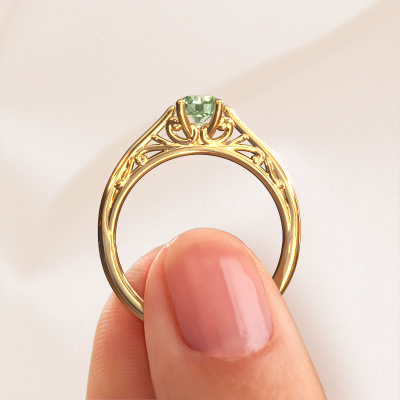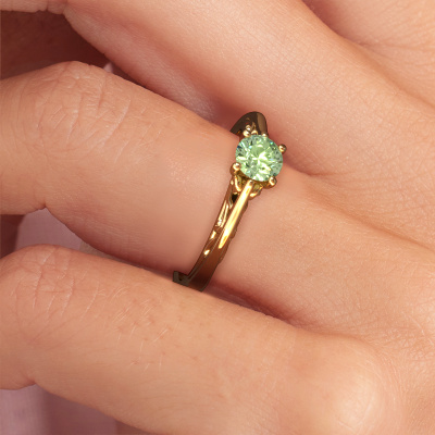 This 14 Carat gold ring is called Shannon rnd and is set with green lab grown diamond. How would you describe the style of the love of your life? Does she have a unique sense of style? This stunning ajour gold engagement ring can be custom-made to your own or her liking. Our green lab grown diamonds gemstones have been carefully selected because we believe your fantasy engagement ring must be adorned with nothing but the most beautiful gemstone. Don't you agree? This jewel is made with passion and love by one of our master goldsmiths.By using a combination of the latest modern techniques, combined with ancient crafting, we can make all our engagement rings in our own studio. Each jewel is made to order. This is advantageous because we can offer you a price you won't find anywhere else.Do you have a specific ring in mind? One you came across somewhere. Please feel free to tell us your wishes and we will turn your design into a unique engagement ring. You can follow the development of your ring design because we use 3D drawings. This gives you a realistic preview of your design. We will gladly send you a non-binding offer, based on a fair price/ quality ratio. It will amaze you.To make it easier for you, we offer a 30 day return policy. Check our terms and conditions.