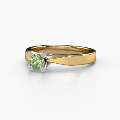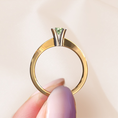 In your eyes, no one else compares to her. She is one in a million, unlike anyone else and pure? These qualities are emphasized perfectly by our traditional gold solitaire green lab grown diamond ring. This green lab grown diamond is carefully selected by our keen artisan goldsmiths. It equals the unique qualities of the love of your life. There is no better way to memorialize your proposal than this symbol of true love. The ring shown above is called the Ichelle 1, we call this a solitaire ring because it contains a single gemstone. The engagement ring is made in 14 Carat gold and has a round green lab grown diamond of 4.2 mm. Each piece of jewellery is made with passion and love by one of our master goldsmiths.