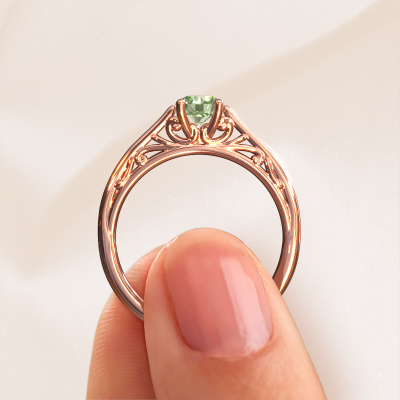 This 14 Carat rose gold ring is called Shannon rnd and is set with green lab grown diamond. How would you describe the style of the love of your life? Does she have a unique sense of style? This stunning ajour rose gold engagement ring can be custom-made to your own or her liking. Our green lab grown diamonds gemstones have been carefully selected because we believe your fantasy engagement ring must be adorned with nothing but the most beautiful gemstone. Don't you agree? This jewel is made with passion and love by one of our master goldsmiths.By using a combination of the latest modern techniques, combined with ancient crafting, we can make all our engagement rings in our own studio. Each jewel is made to order. This is advantageous because we can offer you a price you won't find anywhere else.Do you have a specific ring in mind? One you came across somewhere. Please feel free to tell us your wishes and we will turn your design into a unique engagement ring. You can follow the development of your ring design because we use 3D drawings. This gives you a realistic preview of your design. We will gladly send you a non-binding offer, based on a fair price/ quality ratio. It will amaze you.To make it easier for you, we offer a 30 day return policy. Check our terms and conditions.