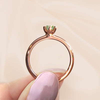 In your eyes, no one else compares to her. She is one in a million, unlike anyone else and pure? These qualities are emphasized perfectly by our modern rose gold solitaire green lab grown diamond ring. This green lab grown diamond is carefully selected by our keen artisan goldsmiths. It equals the unique qualities of the love of your life. There is no better way to memorialize your proposal than this symbol of true love. The ring shown above is called the Lorretta, we call this a solitaire ring because it contains a single gemstone. The engagement ring is made in 14 Carat rose gold and has a round green lab grown diamond of 4.7 mm. Each piece of jewellery is made with passion and love by one of our master goldsmiths.