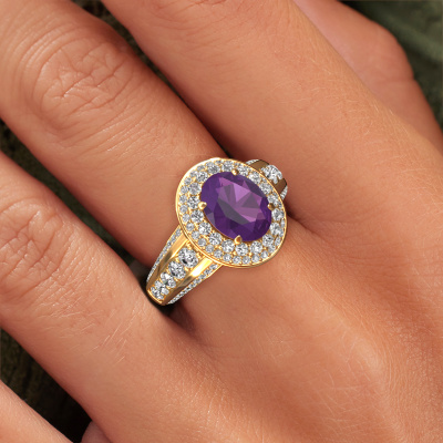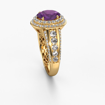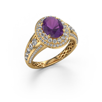 This 14 Carat gold ring is called Nancie and is set with 9x7 mm amethyst. This exclusive gold halo engagement ring is a true work of art! The ornaments are crafted with a lot of patience and great passion. In order to create this ring with great precision, this craft requires a keen eye and skilful hand. A challenge which ignites a fire in our expert goldsmith. The exquisite amethysten are set in a special way so they stand out even more. This gives the ring an even more glamorous appearance. The graceful engagement ring is actually unique on its own because of the gemstones which we carefully select especially for this ring. On top of that you select the precious metals which will be used to create a unique ring for the most extraordinary woman in your life! This jewel is created to add sparkle to your finger, each jewel is lovingly made by hand by our goldsmiths.Are you on a budget? Please feel free to contact us, so we can go discuss your options. We offer our engagement rings at guaranteed best price, because we make them to order. You won't find such a price anywhere else!Our designers and goldsmiths work together each day, creating new jewels. Perhaps you have found a nice classic engagement ring somewhere, which can be used to customize your unique ring. Please feel free to contact us. We will make you an offer, based on a fair price/ quality ratio, which will amaze you.To make it easier for you, we offer a 30 day return policy. Check our terms and conditions.